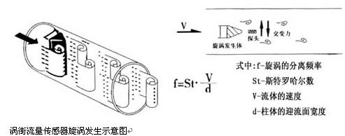 一定雷諾數(shù)范圍內(nèi)(2×104~7×106 ),旋渦的釋放頻率f與流體流速V及旋渦發(fā)生體的迎流面寬度d之間關(guān)系式為f=St?v/d,式中St為斯特勞哈數(shù),它是一個(gè)無(wú)量綱的系數(shù),只要準(zhǔn)確測(cè)出頻率f,就可以求得流體流速v,由v求出體積流量。