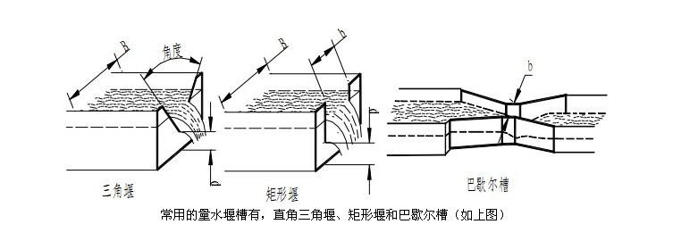 常用的量水堰槽有,直角三角堰、矩形堰和巴歇爾槽(如下圖)