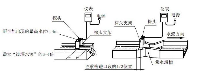 超聲波明渠流量計(jì)的探頭可以直接安裝在量水堰槽水位觀測(cè)點(diǎn)的上方。探頭發(fā)聲的一面要對(duì)準(zhǔn)水面??梢杂盟匠叻旁谔筋^上蓋上,通過(guò)校上蓋水平使探頭對(duì)準(zhǔn)水面。巴歇爾槽水位觀測(cè)點(diǎn)在距喉道2/3收縮段長(zhǎng)位置(如下圖的La);三角堰、矩形堰在上游一側(cè),距堰板3~4倍過(guò)堰水深處。(如下圖)