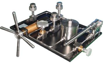 打開輸出1、輸出2堵頭,打開穩(wěn)壓閥,將微調(diào)調(diào)至適當位置鎖閉疏空閥,輕輕操作杠桿使導壓液體至輸出口,安裝標準表及被校表,操作杠桿升壓至檢定點附近,用微調(diào)逼近檢定點,逐點檢測至滿程。